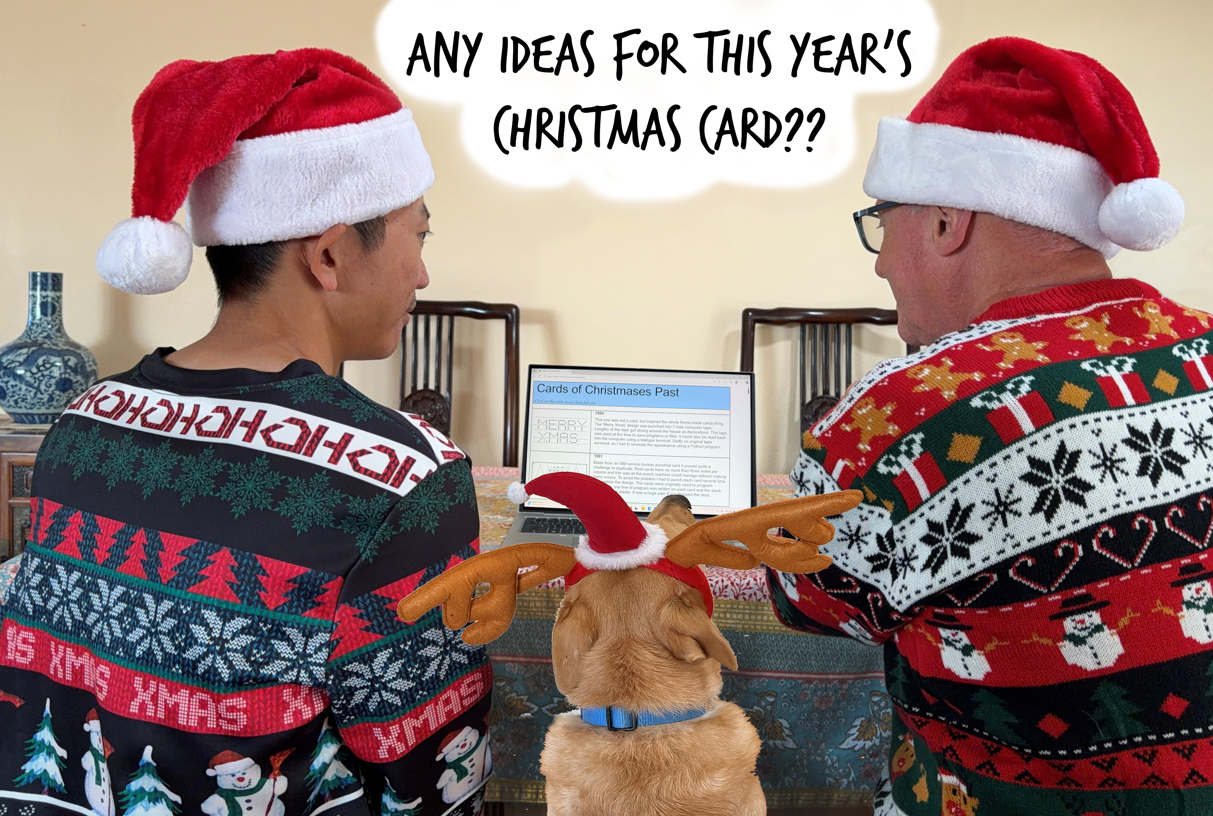 2025 This whole Christmas card thing is a challenge! Every November a new design is needed to make the overseas posting dates. This year you see Alan, Bingo and me trying to dream up with a fresh idea. No AI this year, it is a simple montage of shots of the individuals using old school Photoshop. |